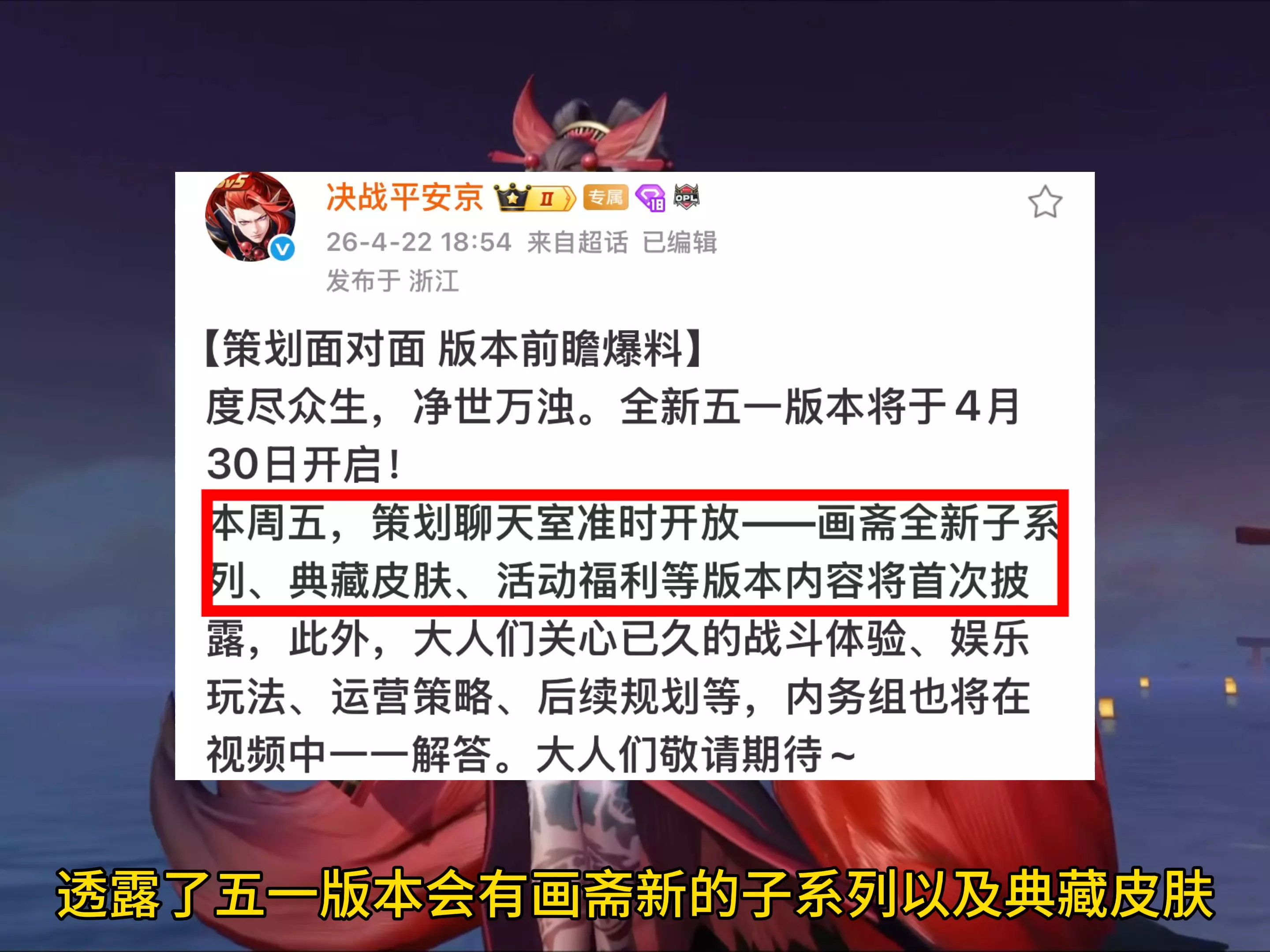 这是《决战!平安京》的版本爆料内容,游戏全新五一版本将于4月30日开启,本周五策划聊天室将披露画斋全新子系列、典藏皮肤、活动福利等内容,还会解答战斗体验、娱乐玩法等玩家关心的问题。