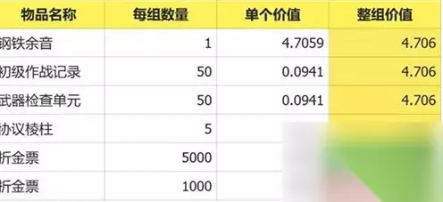 3、中等价值物资性价比一致:初级作战记录、武器检查单元、协议棱柱的整组价值相同,可根据自身开荒需求灵活替换,但优先级低于5000折金票与钢铁余音。
