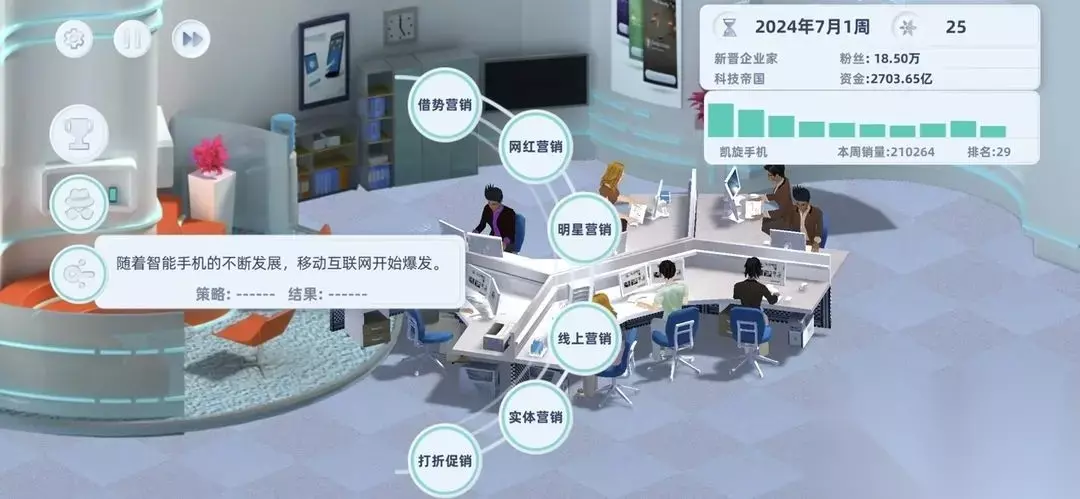 十二、关于营销策略 1、营销是左边第三个图标:这是一个不花钱又可以帮助你提高销量的捷径,每个季度刷新一次,一定要记着用。 2、公司战略还可以强化营销的效果,市场营销是你赚钱的利器。