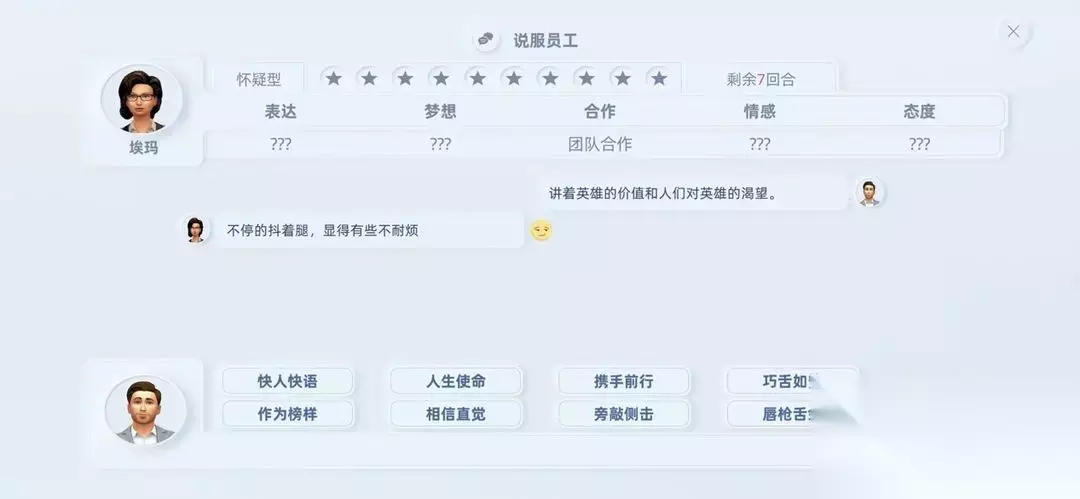 十三、关于说服系统 1、紫色的是说服策略,策略可以降低难度,但策略必须配合一个或两个话术一起使用; 2、“口若悬河”是终结技,要慎用,不成功便成仁。 3、员工等级越高,说服难度越高,如果真的没信心就去资本市场买本书吧。