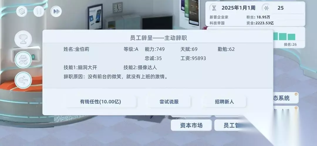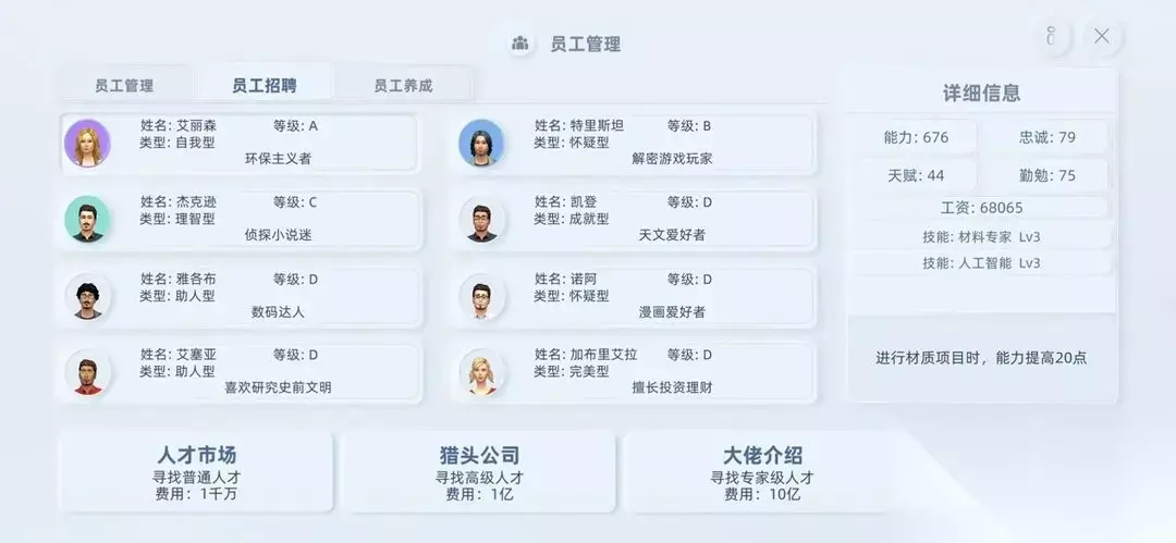 三、关于员工招聘 1、共有三个等级的人才市场; 2、每半年初级人才市场会自动刷新一次; 3、C级员工可以直接招聘,B级有一定概率触发说服系统,A级和S级必须说服她。如果你发现了优秀人才,又对自己的说服技巧没信心,可以去“资本市场”买对应等级的道具书(一次只卖一本),资本市场也是半年刷新一次。 4、人才市场只能刷出B级人才,猎头公司可以刷出A级人才,大佬介绍刷出的全部是A级人才。S级人才需要你收购目标公司后去挖人来获得。 5、保持一定的人员流动会让游戏更简单,所以记得经常看看人才市场或者去挖角,竞争对手的人才是1年刷新一次。