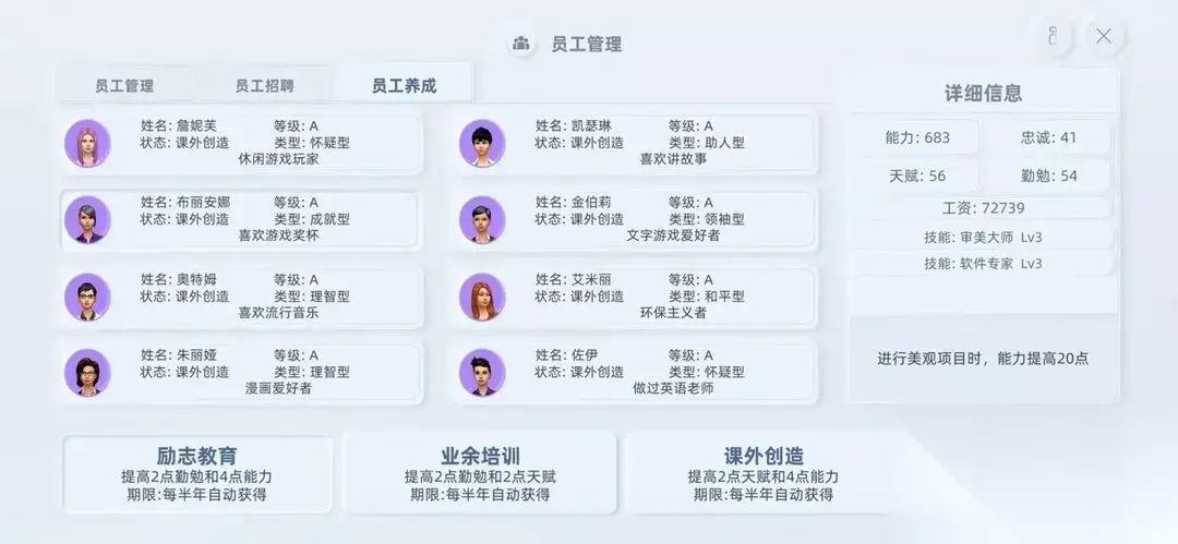 四、关于员工养成 1、员工养成是不花钱的,所以一定不要忘记; 2、具体怎么养成,要看员工的属性特点。比如一个员工是(勤勉50点,天赋20点),推荐选择第一个加勤勉和能力的养成策略。如果员工时(勤勉20点,天赋50点),那么这个员工比较适合用于团队突破,可以选择加天赋和能力的养成策略。每次养成花半年时间,养成完成左下角会有提示,这个时候注意要继续培养。养成虽然加的能力不多,但是时间越长差距就越明显。 3、能力书,资本市场中加(1-3)能力的书非常便宜,每1年更新一次,可以让一些勤勉低,天赋高的员工吃书。
