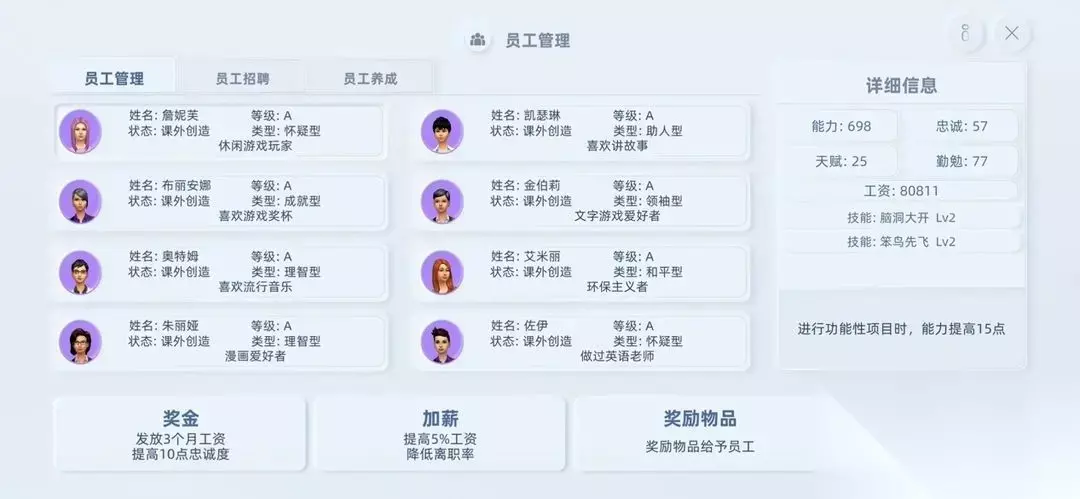 二、员工属性 1、能力值:能力越高对所负责特性的加成就会越多。游戏每年对员工的基础能力值要求都会增加,如果能力达不到每年的基础要求,就会拖后腿,会减分。所以能力是最为关键的一项属性。 2、勤勉值:勤勉值决定了能力的成长速度,勤勉越高每年员工自动提升能力的数值会越多,每年员工的能力会自动成长一次。 3、天赋值:天赋值决定了技能的升级速度,另外天赋值还跟团队突破的分数正相关,天赋越高突破分数越高。 4、技能:分为自动生效和对应生效两种,比如“结构专家”这种技能,你要把他放到“厚度”的位置上才能产生加成效果。 5、忠诚度:如果你用的不是自动加忠诚度能力的主角,员工的忠诚度会逐年降低,忠诚度过低会离职或者被竞争对手挖走,加薪、奖金或者吃书都可以快速提高忠诚度。 6、员工等级:员工等级分为S、A、B、C、D五种,S级为最高级拥有3个技能,A级有两个,B级和C级都是一个。