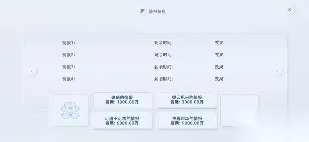七、关于情报系统 1、不是所有的情报都是好情报,有些是坑; 2、初期尽量选择“1000万”的情报,要求的卖点都是初级卖点。“2000万”的情报卖点会有高级卖点,新手在初期很难达成。