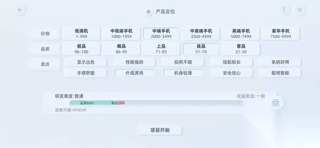 六、关于手机价位选择 1、选择的价位越高,最大利润越高,但研发费用也越多,成本也更高。 2、初期建议选择“中端”或者“中低端”,相对比较保险。员工能力和科技上去之后就可以尝试中高端以上的手机了。