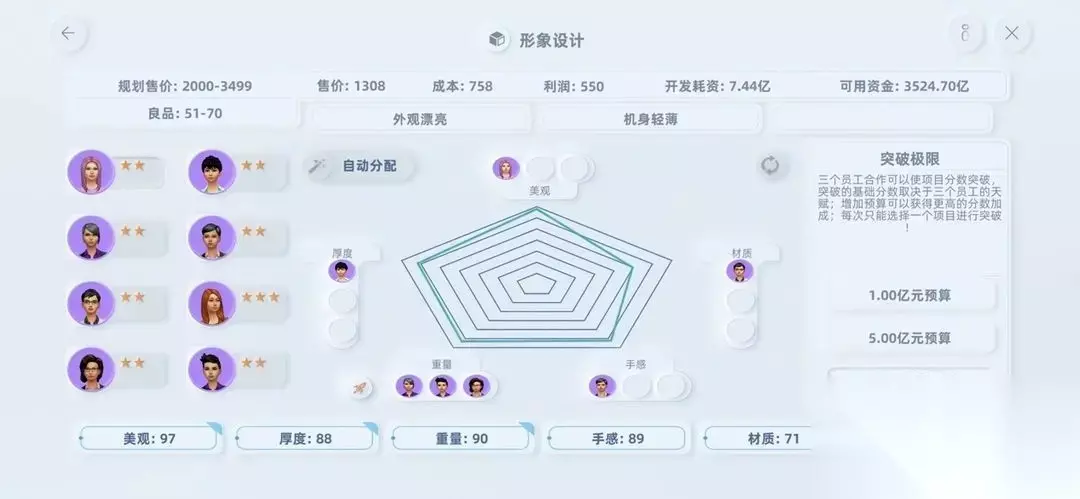 五、关于突破 1、团队突破是极为重要的! 2、如果你选择的是高等级卖点(100分+67分)这种,在初期想完成100分特性是非常困难的,突破可以起到弯道超车的效果,让你最大程度上节约成本。 3、突破最为核心的是三个负责突破员工的天赋值,然后是你选择的突破等级,所以你的团队如果有几个高天赋的员工会让你完成很多不可能完成的任务。 4、每个环节只能选择一项特性进行突破,如果你有两个特性都是3个人,用鼠标点击那个“小火箭”可以切换你要突破的特性。