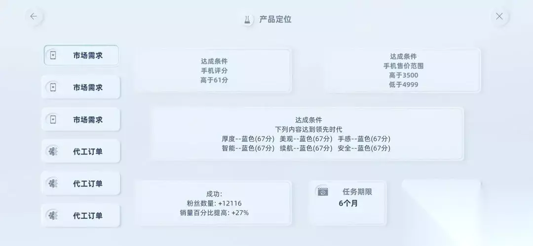 《手机帝国》是一款以“造手机”为题材的高自由度单机模拟经营游戏。 玩家将扮演一名回到2001年的创业者,凭借独到的眼光和神秘投资人的支持,创立一家可能改变世界的科技企业。 游戏从2001年开始到2035年结束,玩家需要从研发最早的九宫格智能手机开始,逐步发展到可完全独立使用的AR智能眼镜。 手机帝国新手前期攻略指南 一、关于卖点 "卖点的完成难度是不一样的,在初期硬件卖点的难度相对偏高,设计和软件相对容易。在初期特性要求100分的卖点,通过拉条或者堆硬件是很难完成的,如果合理使用“突破”功能,整体的完成难度会降低很多。另外在初期也不建议去做有100分特性要求的卖点。