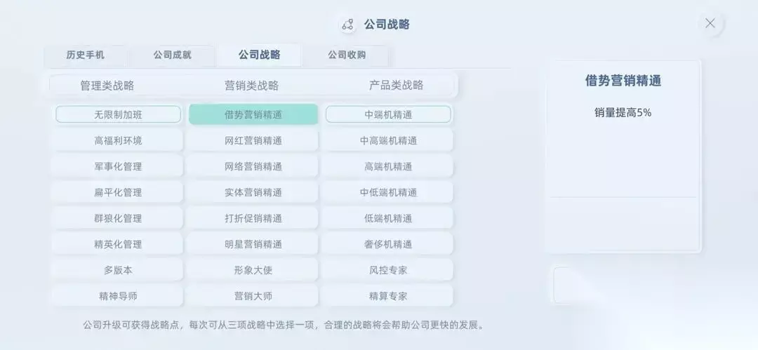 十一、关于公司战略 1、每次公司升级会获得一个战略点,研发的手机分数越高,公司升级速度越快,新图纸有20 % 的经验加成,新的卖点组合会有50%的经验加成; 2、公司战略如果点错了可以去资本市场买书重置; 3、公司战略在中后期可以解锁强大的新型“项目管理策略”,部分策略可以增加员工的星星数量,这个在后期用处巨大。