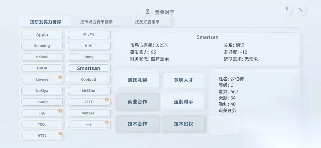 十五、关于竞争对手 1、和竞争对手保持合作可以降低手机的研发成本和研发资金; 2、挖人会降低和竞争对手的关系度; 3、竞争对手达到敌对关系时(黄色)会主动来挖你的员工。 4、如果达到仇敌状态(红色),会主动发布***,打压你的产品销量。 5、如果你的手机分数超过仇敌状态竞争对手的研发实力,则不会受到打压。 6、当然你也可以通过各种打击手段去降低对方的研发实力,当然关系也会更加恶化。