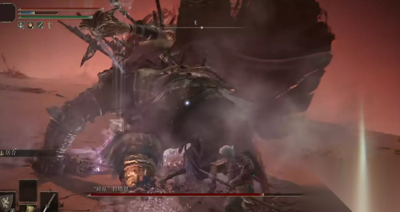 碎星拉塔恩的体型比较大,拉扯方面非常的困难,需要及时看清楚它的起手动作。触发BOSS战以后,先骑上马往后面跑。因为它会朝着咱们远距离射出一箭,拉远一点的话就有足够的躲避时间。当看见远处有紫色光过来的时候,往侧边去跑躲开它的第一发攻击。当锁定丢失以后,迅速调头朝着碎星拉塔恩的方向,这样它就不会再次发射弓箭了。当咱们离它的距离足够近的时候,它就会举起双刀往我们这边跑过来,离近距离的时候碎星拉塔恩会使用出一个六连劈。当自己靠近BOSS的时候,它的这个招式是打不着咱们的,而且同时有三次使用战技居合的时间。在它放这招的时候,他会前抬脚往前面迈一步,掌握好节奏钻到它后面,就能对其进行伤害白嫖。
