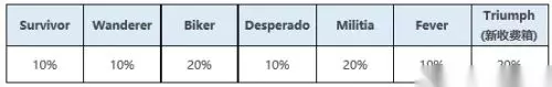 我们将在测试服内提供100,000 BP,20个武器外显钥匙(Weapon Cosmetic Key), 20个早鸟钥匙(Early Bird Key) 和10个胜利箱(Triumph Crate) 以检测服务器的稳定性。 - 新的付费箱子(Triumph)可以归类为每周随机箱,玩家可以获得的机会为20%。 : Triumph箱子可以使用武器钥匙解锁,该钥匙可通过STEAM市场购买 : 除了箱子给出的基本奖励之外,玩家们可以通过箱子获得2套奖励套装,这是只给予幸运玩家的额外奖励。 - 每箱的奖励获取概率如下