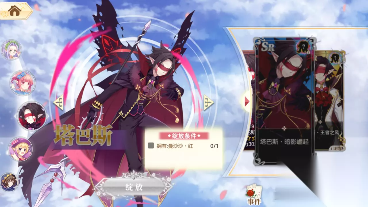 等我们抽到R卡的塔巴斯时,我们离SR的塔巴斯就不远了。点击羁绊,找到塔巴斯,去绽放他就能获得一张SR卡的塔巴斯了,不过绽放条件比较难得到,是需要拥有曼沙沙·红,这个物品也可以在神树那儿抽到。