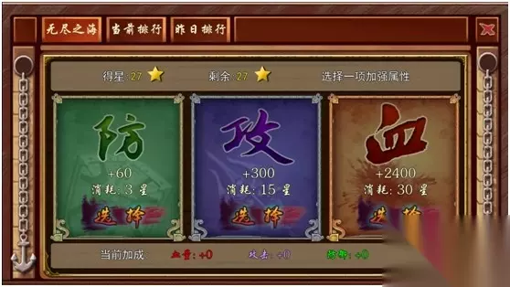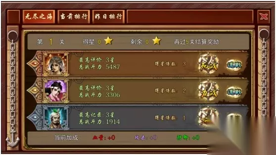 当前排行顾名思义就是当前玩家的血战排行,该排行只取前10名,以闯关数与得星数为第一第二优先级进行评定,每日24点血战排行前10的玩家即可计入昨日排行。昨日排行榜上有名的玩家可获得对应的称号与属性加成(该加成对血战无效)。