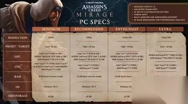 3、4K分辨率需要11600K处理器和3080显卡的支持下才能完美运行。 4、并且刺客信条幻景这款游戏支持DLSS/FSR,PC玩家的帧数得到保证。 最低配置: 需要 64 位处理器和操作系统 操作系统: Windows 10/11 处理器: Intel Core i7 - 4790K or AMD R5 1600 内存: 8 GB RAM 显卡: NVIDIA GTX 1060(6GB) or AMD RX 570(4GB) DirectX 版本: 11 网络: 宽带互联网连接 存储空间: 需要 40 GB 可用空间