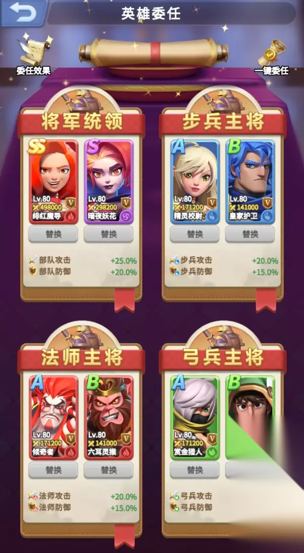 4、英雄委任部分英雄自带军事委任技能,可大幅提高士兵攻击和防御,如B级英雄六耳灵猴,虽然他上不了主力阵容,但委任技能皮甲专精可提升法师15%防御,类似的还有B级神眼射手、皇家护卫等,这些英雄碎片获取容易,务必记得对其进行升阶和委任哦!