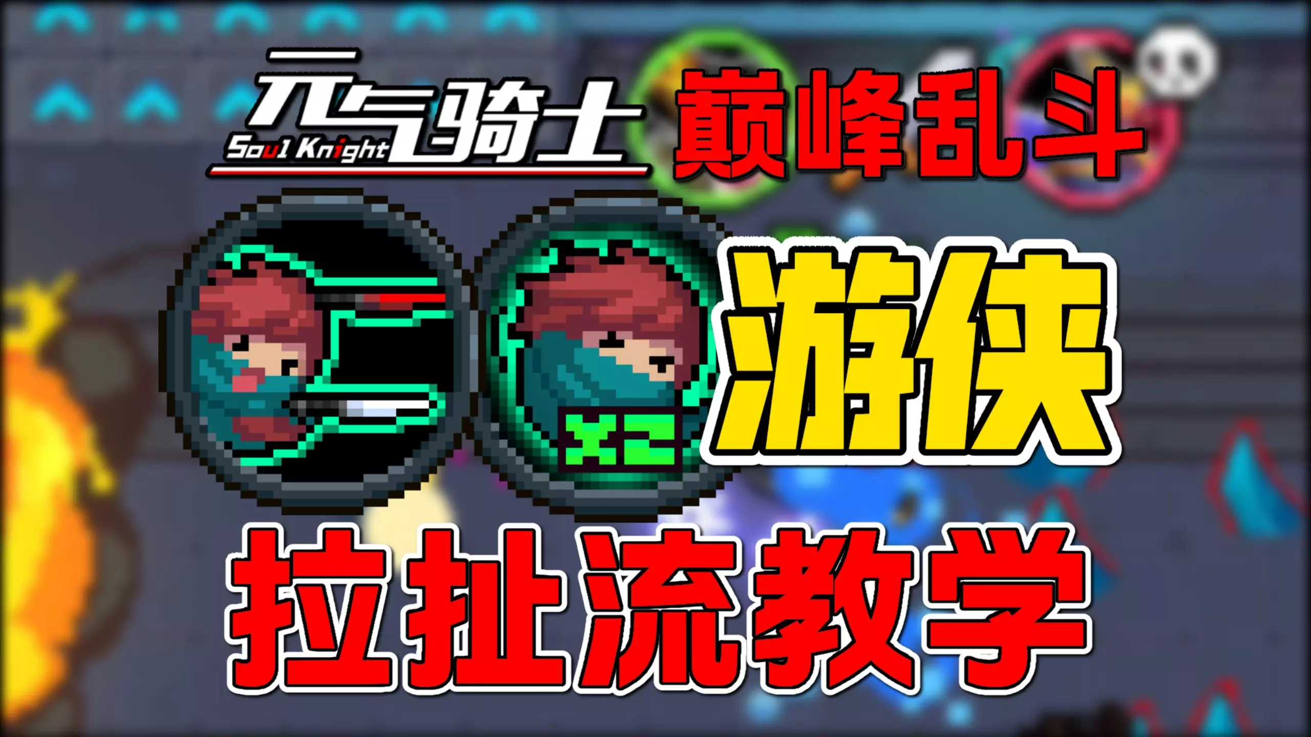 这是《元气骑士》巅峰乱斗模式的游戏解说,解说提到该模式别选骑士,选对角色能直冲榜一,还可白嫖付费皮肤,同时展示了战斗画面与角色技能效果。