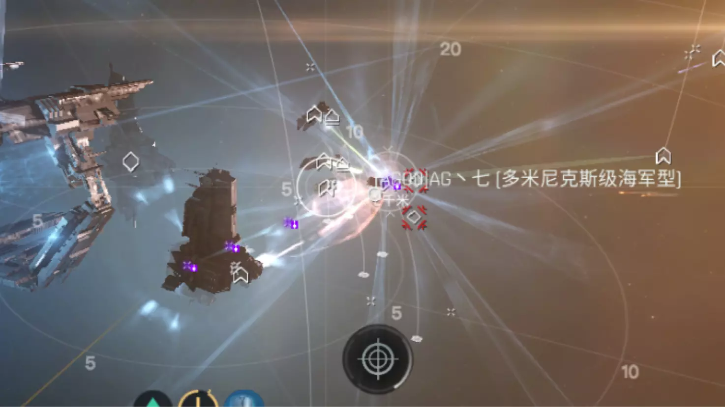 当然,以上配置可将红盾换成隐身装置,方便本地来红时可以及时隐身躲过红名地毯式搜索。 反收割派 顾名思义,反收割派拥有一定的反击和牵制能力。一个好的配置可以让敌舰在原地被救援的队员击杀,甚至自己单杀敌舰。但同时由于需要对敌方进行牵制,自身需要一定的防护能力才能避免队友尚未赶到就被怒火冲天的敌舰给船蛋双飞了。反收割派有两大类型,一为主动型,二为辅助型。(注意使用反收割派配置的前提是队友能够在一分钟里边赶到并进行救援,否则会因为自保能力不足而机毁人亡) 主动型:主动型的牵制作用更为直观,主动型配置适合在单人和多人同时挖矿时使用。主动型配置将自己的所有的能量用于牵制敌舰。常用的方法有使用跃迁扰断让敌方无法跃迁逃离现场,而后的大毁电可以直接让敌舰变成废铁。跃迁加速在敌舰试图通过离开你的跃迁扰断距离时有效快速减少速度差。配置底槽是红盾,损控,跃迁加速器,中槽是跃迁扰断器,大毁电。配置可以进行适当调整。