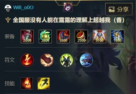 出装描述: 露露没有必要出肉,冰泉这种装备露露出了到底有个p用,这一套才是输出流的答案,工具人的同时还能补伤害,但是需要经济,所以不能辅助玩这套。 出装、天赋(符文)推荐三