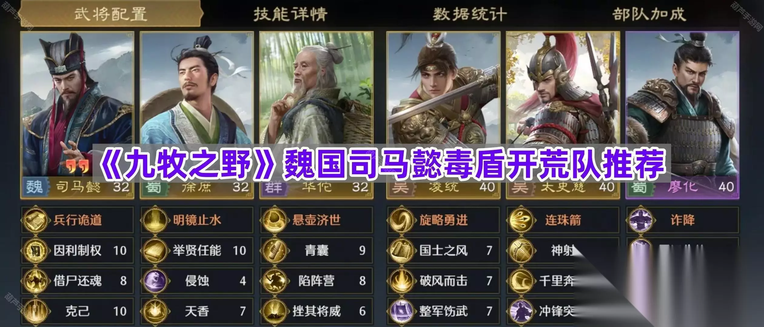 《九牧之野》魏国司马懿毒盾开荒队推荐 一、队伍玩法介绍 这队是目前开荒打架都非常好用的毒盾,首先够肉能抗,其次伤害是远远比不断,连绵不绝 司马懿做主将除了高额的伤害外还会给敌方加上反噬的效果,让对面发动主动或突击技能时,受到持续伤害,非常符合毒盾的特性。 其次搭配上徐庶还能释放多种持续性伤害包括中毒,在司马高伤害的同时再添上一把火,最后搭配上华佗让你的队伍巡航能力爆表,并且还能解除多种控制技能的束缚,可以说是又毒又肉还防控,群战的时候对方既不能轻易的解决你,又害怕受到你的持续的伤害,妥妥的战场万金油。 二、配将思路 1、首先司马盾的核心是毒 这队的核心技能就是借尸还魂,若目标存在中毒状态可以额外造成谋略伤害(受智力加成)还能回血,简直是能打能回,杀人放火必备神技。 围绕司马毒盾的建队思路就打开了,首先要保证对方身上有中毒状态,侵蚀这个紫色技能就非常的实用了,保证中毒状态能持续的存在,加上徐庶的自带技能,中毒问题基本能得到有效的解决。