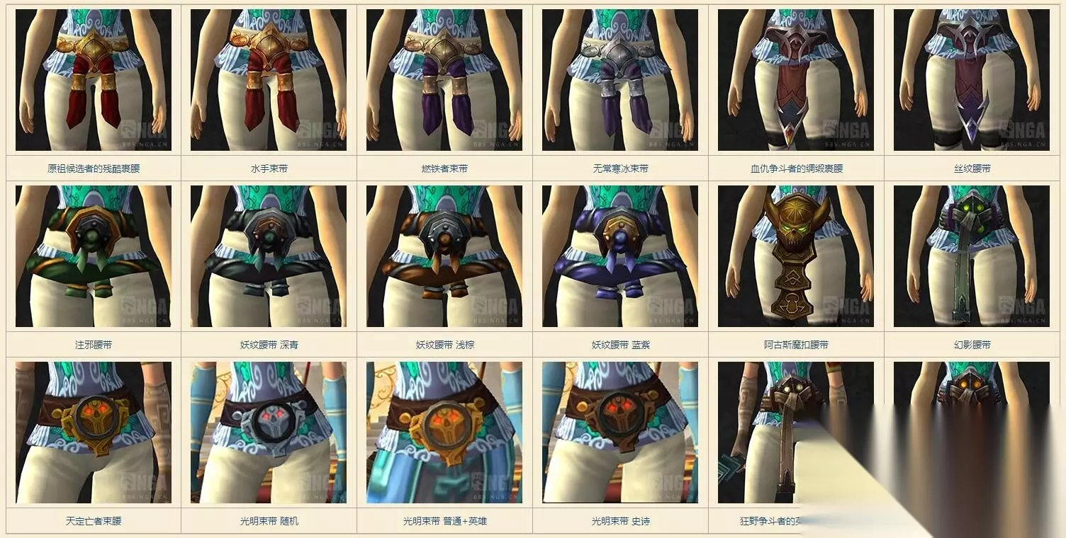 如果你就喜欢白大腿~OK~有个百搭的方法~ 黑暗聚焦护腿或者纳鲁短裤+轻舞之靴或者巨魔鞋+铁纹手套,头、肩膀隐藏~ 腰带选崩岩腰带这个系列的模型: 原祖候选者的残酷裹腰 (金红) 邪影腰带/水手束带 (亮金红) 崩岩腰带/无常寒冰束带 (银紫) 邪法术带 (淡金紫) 然后战袍随便换吧~武器随意~ 举几个例子:
