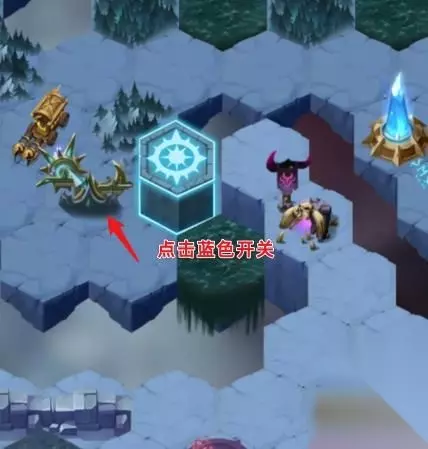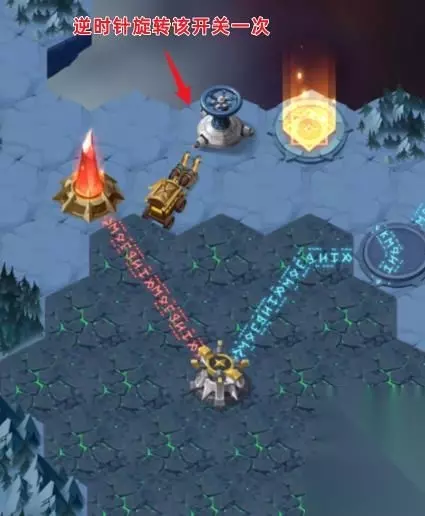 挑战上方道路敌人后,继续前行 顺时针旋转三次蓝色的开关,下方的区域会被照亮 接着挑战下方中间道路的敌人,将轨道移动到左侧 移动后,挑战左侧道路的敌人,将轨道移动到上方 点击蓝色的开关,升起石柱