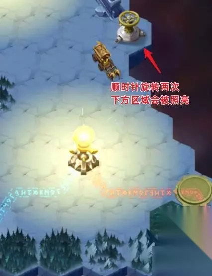 地图右侧上方区域会被照亮,挑战道路的敌人,来到该区域 顺时针旋转两次黄色的机关,下方的区域会被照亮