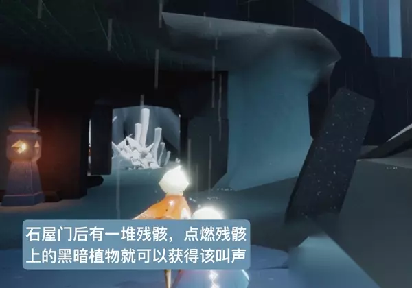 2、我们在石屋这里可以看到有一堆的巨型鱼骨,我们只要烧掉上面的大花即可获得鲸鱼叫声。