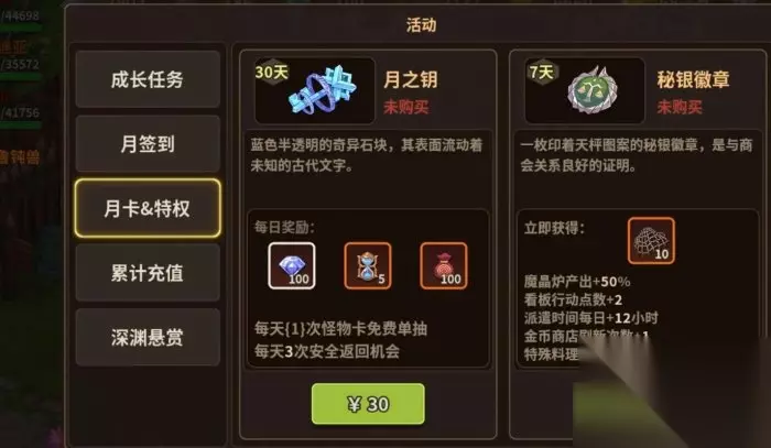 新人有7天成长任务,一定要做完,给的物资很丰富,每月签到奖励和深渊推图的深渊悬赏也在这里