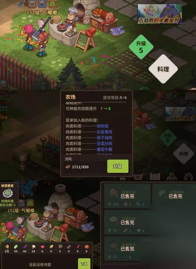 ◆农场 ❈料理:用于制作人物升级需要的经验,大多高级料理需要的食材会有鱼,需要钓鱼获得,人物升级需要的经验贼多,尽量每天的料理都做完,特别是高级料理 (人物三星前我都是均衡发展,料理平均分配,差不多一起到的三星,都三星后就主喂主c了,主c到达四星,再升另外两个,个人用法,仅作参考) ❈升级:等级越高能做的高级料理就越多,农田数量也会变多