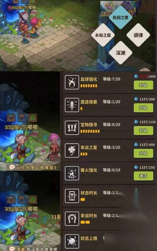 地图上有钓鱼点,矿脉任务和幻境之塔 幻境之塔层数随着深渊推图逐步解锁,是轮回之砂和卡牌升级资源的主要来源,层数越高奖励越好,难度也越大,可以开房去公屏上请好心的大佬帮忙过图