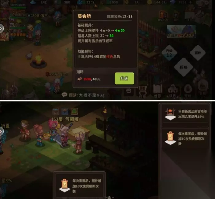 《浮石之旅》新手攻略大全 一.基础建筑解说 1.需要木材升级的建筑:集会所,农场 集会所>农场,有木材,优先升级集会所! ◆集会所 ❈招募:主要用于海淘人物,优先升到7级,7级人物可升到三星,9级出橙色品质,11级可以看人物资质(就是属性评级scs啥的),14级解锁红色人物(尽量早到14级),后期升级可以洗人物成长,红色人物解锁前不需要考虑人物性格,前期不要花太多金币在刷新人物上,金币多攒着,后期刷红色品质很缺!红色人物刷到就都招募了,分解红色人物可以得到灵魂结晶,可以用于洗人物成长评级!世界上有人花了50w金币才刷到一个红色品质,还不是自己想要的!9级可以停一下升级一下其他建筑 ps:前期迷茫不知道用什么阵容,可以每个不同技能的角色都备着一个,后面可以直接置换人物,不用再花钱刷人物,还有大佬说后面人物的性格和资质都是可以洗的,所以前期不用太纠结!