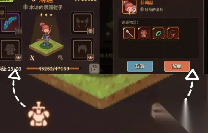 功能:更换装备、解雇队员、装备时装、队员属性值查看、喂食经验料理、卡牌更换、卡牌升级 ❈时装和解雇是人物等级条上面那两个小图标,浮石弓属于时装类,解雇人员的时候,装备和卡牌会全部返还