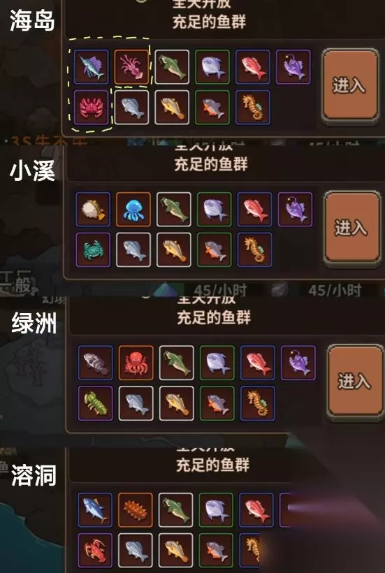 三.钓鱼 1.钓鱼点:钓鱼一共有七个 地图上四个:小溪,海岛,废墟绿洲,炽热溶洞,每个地方都有一橙一紫一蓝的鱼不同,其他都一样