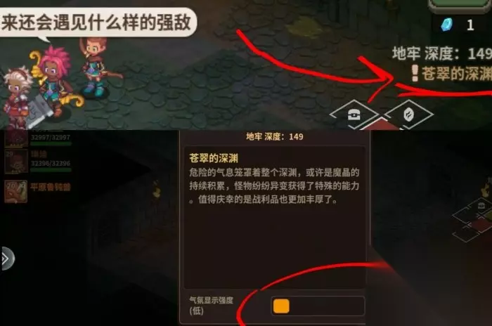 特殊深渊:在进入的时候,右上角返回下面会显示!xx的深渊,点击感叹号处可以调节气氛显示度