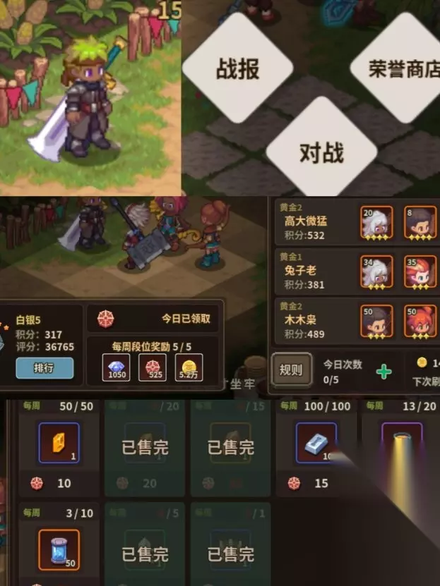 7.竞技场 对战:每天对战一次就可以拿到每日奖励,不管输赢,每天有5次免费对战次数,每天5次尽量打满不管输赢都有荣耀勋章,前面刷新页面都是花费金币,后面就变成钻石了,所以尽可能前面就把5次打完,能赢最好,赢了会升段能提高每周奖励,输了会掉段位 荣耀商店:每周刷新,每周的宝石,涂料,尽量兑换完,特别是宝石,剩下的按需要购买