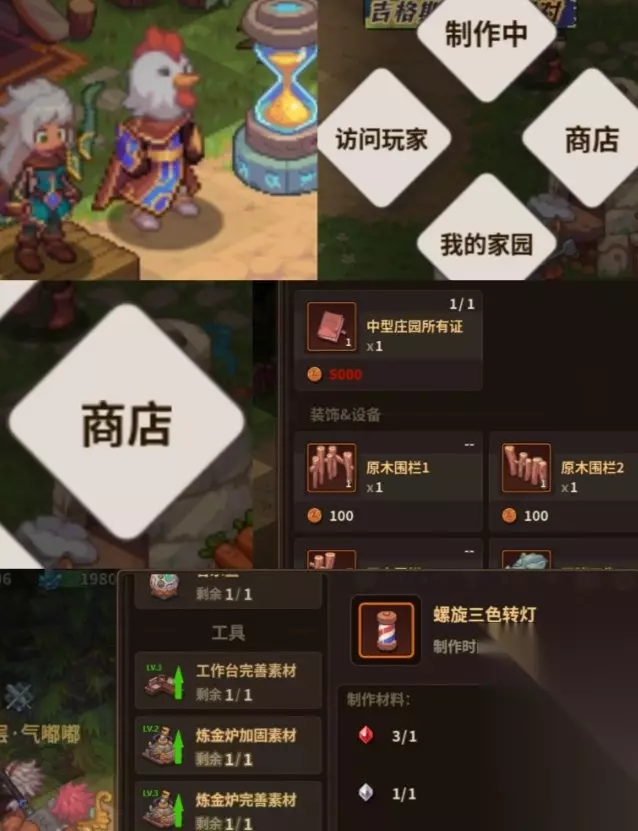 6.家园 进入家园前需要现在商店购买庄园所有证,然后进入家园摆放好工作台,就可以在工作台制作摆件啦 家园里不能种花,商店卖的土地和种子是制作材料,工作台升到二级就能用上了,种田?别想了~ 炼金炉做出来后,可以制作强化石卡牌升级材料等,但是蛮划不来的,前期不推荐制作
