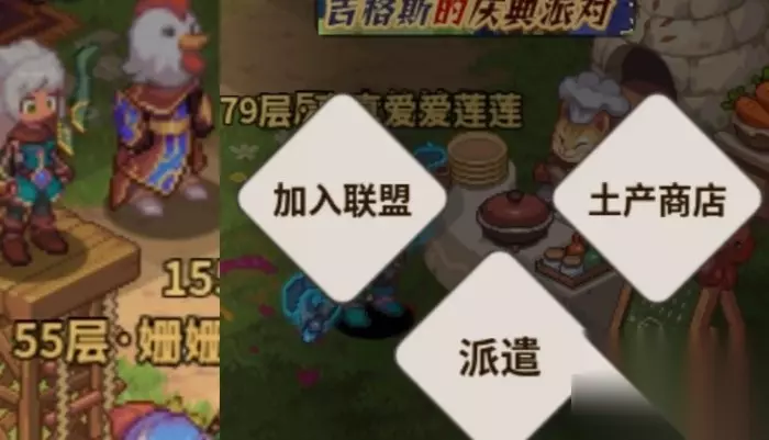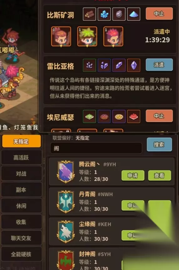 派遣:资源获取,前期推荐派遣建筑材料和食材 联盟:联盟页面进去是什么都没有的,可以点击搜索就会刷新出来,或者去公屏上看有需要人的公会没有。联盟暂时用处不大,联盟兑换的物品很费金币和建筑材料,前期没有太大必要,好奇里面有啥也可以加进去看看,退出联盟要冷却一段时间才能再加入