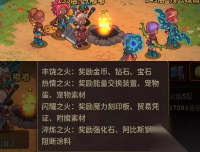 2.篝火:每周活动,可得到不错的奖励,一定要参加,周一到周日随时都可以投柴火,活动奖励和深渊层数相关,只有达到4000贡献度,篝火等级达到五级,就能得到当前深渊层数最高奖励,这里要注意,目前贡献度投多了没有多余奖励,也就只能打打榜,看着好看,受人瞩目,不知道后面会不会出贡献度排名奖励 篝火名字不同给东西也不同,应该是按周轮着来的,上周是丰饶之火这周热情之火,下周应该是闪耀了