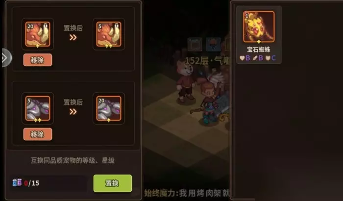 暂时没太喵用 ❈等级置换:现在置换的材料除了篝火活动没有其他获得途径,而且只能同品质宠物置换,就是橙色只能和橙色换,紫色只能和紫色换,所以前期留着体液别乱升星低品质宠物,后面得到高品质宠物没有体液材料,经验食物啥的,还要靠卖东西攒钱买