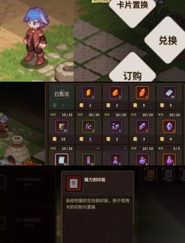 8.抽卡商 ❈订购:卡牌抽取,无力吐槽,我基本每次都要吃保底 ❈兑换:兑换需要文章残页,营地商人处售卖卡牌可以得到文章残页,优先兑换抽奖券,其他看需购买 ❈卡片置换:只能同品质卡牌置换,且只能置换卡牌等级,星级,前期不确定卡牌组合之前,可以先把成长材料攒着,不要盲目升级卡牌,目前,置换材料途径太少,置换需要的刻印板目前只能在篝火活动中获得