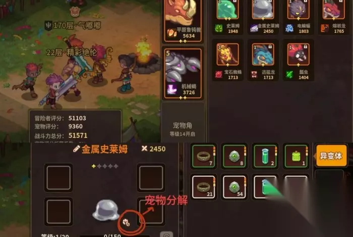 宠物的升级,装备佩戴,宠物阵容更换,属性查看,多余分解都在这里 要注意的是,宠物分解只会返还同品质宠物结晶,宠物体液和佩戴装备,宠物喂食的经验材料,是不会退还的!所以前期不要盲目喂养,集中资源给红宠,实在开不出红,可以浅养一下橙(别看我的,我休闲玩家!无所畏惧)