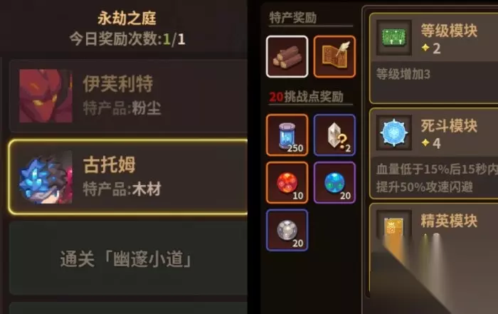 ❈轮回之匣:每日可领取一件装备,装备等级和深渊层数相关 ❈永劫之庭:每天可打一次,模块选的越多奖励越丰富,但boss也更难打,boss等级和深渊层数挂钩,这里建议每天卡一下深渊层数,不要过高,以免第二天六模块永劫之庭打不过,只能减少模块少拿奖励,每天的buff随机刷新,可得到建筑材料、概念构成体、宝石、卡牌升级材料、概率获得套装图纸