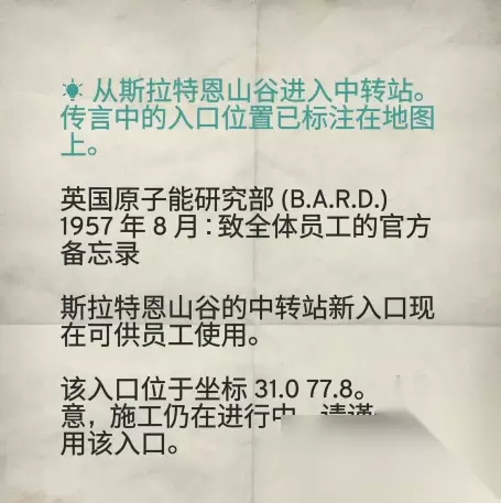 在全是上下床的房间里,一旁的桌子上有“备忘录:中转站入口” 捡起纸条中转站入口就会标注在地图上。当然别的线索也能找到中转站的入口位置。如果只想快速完成主线,可以直接前往中转站。