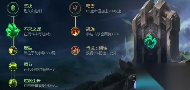 盖伦中路的天赋选择——在这里,天赋的分配相当直接,采用“坚决”和“精密”作为主副系,选择“不灭之握”将在战斗中每隔4秒,使你的下一次普攻造成等同于你4%最大生命值的魔法伤害,并回复2%的最大生命值,同时永久增加5点生命值。这样一来,你在削减敌方血量的同时,自身并不会处于危险之中,对敌方而言,则是一种混合型伤害的威胁。