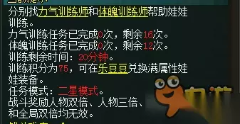 问道娃娃训练营日常任务攻略,游戏里相信每个人都携带着自己的娃娃吧!哪么怎样让自己的娃娃成长呢?以下233乐园小编为大家带来问道娃娃训练营日常任务攻略,一起来看看吧! 娃娃训练营任务领取NPC:乐豆豆。 任务分为两种模式,分别是一星模式和二星模式,两种模式均不消耗娃娃心情和饱食度。每天的训练时间为20分钟,可领取娃娃双倍时间(人物双倍,三倍,全局均无效)。 一星模式分为四种训练模式,分别是灵敏训练,智慧训练,体魄训练和力气训练。