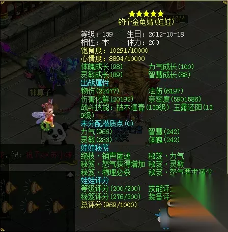 注:此图所说的娃娃双倍为血婴、元婴双倍。 每场战斗结束后可以获得娃娃亲密,娃娃经验和娃娃训练积分,有几率额外获得娃娃精魂,娃娃秘笈,娃娃绝技和娃娃装备。 娃娃亲密重要性自不必说,我们做这个任务,就是冲着亲密来的。娃娃训练积分可以用来兑换满属性娃娃装备(每300积分可兑换一件指定的单吸装备,此装备非赠品可交易)。娃娃精魂等额外获得的物品基本可以满足此任务的血法药品开支。 既能获得亲密,经验,又能获得满属性装备,还不需要支付药品开支,所以强烈建议每天必做。 先来看下一星模式下的具体任务。 注:娃娃评分的高低会影响到数值奖励,所以建议为你的娃娃配上装备和秘笈等提高评分,下面以小编的娃娃(600W亲密的娃娃非常厉害有木有)为参照物来介绍任务。