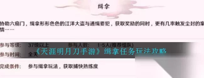 天涯明月刀手游缉拿任务怎么玩?玩家到达37级就能参与缉拿任务,每队最多5人参加,完成任务能获得丰富奖励和捕快熟练度。下面小编给大家带来《天涯明月刀手游》缉拿任务玩法攻略,希望能帮助到小伙伴们哦。