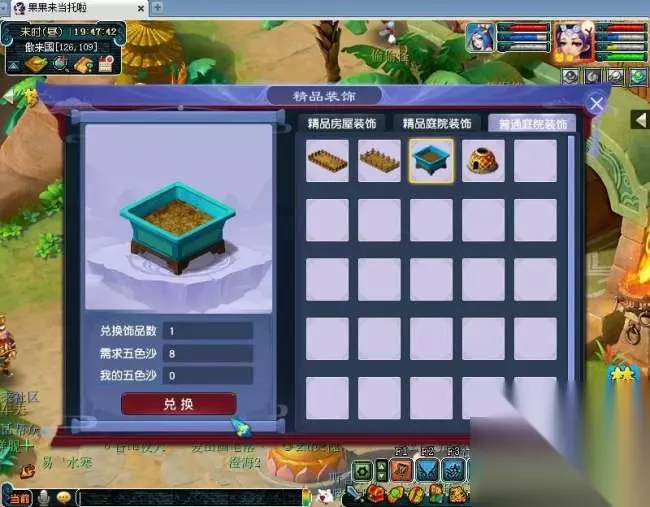进入右上角有个普通庭院装饰,可以看到使用五色沙可以兑换花圃和花盆。