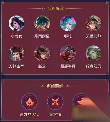 东方神话刺客流: 刀锋主宰、天蓬元帅、赵云、哪吒、小龙女、绯雨剑星、服部半藏、绿森幻灵 坦克瑞兽流: 天蓬元帅、熊猫武僧、强袭龙魂、玄灵圣木、张飞、哥斯拉、福娃、罪业狂屠 六羁绊混搭后期流: 熊猫武僧、玄灵圣木、绿毒巨人、吕布、张飞、李小龙、福娃、罪业狂屠、诸葛亮 八军对战,胜者为王!各位喜欢自走棋玩法的小伙伴不要忘了参与赛事哦,顶尖对抗等你来报名。 相关: 《英魂之刃口袋版》版本大更新 新英雄亚瑟王正式上线 《英魂之刃口袋版》S7赛季盘点 群雄逐鹿问鼎至尊 看我红妆变武装 《英魂之刃口袋版》巾帼女将花木兰上线 《英魂之刃口袋版》10月19日新版本上线 新增玩法大曝光 《英魂之刃口袋版》魔神蚩尤登场 万圣节狂欢趴重磅来袭 《英魂之刃》X《OVERLORD》联动今日曝光 众多人气角色登场 畅想丰厚好礼 《英魂之刃口袋版》新春活动大曝光 蹴鞠大战一触即发 《英魂之刃口袋版》清明活动来袭 神兵战姬从天而降《英魂之刃口袋版》新机甲皮肤上线 GANK能手霸野区 《英魂之刃口袋版》武林狂侠神雕侠登场 与志同道合的小伙伴一起打游戏,新游必有激活码,新服必定有礼包,以满足玩家各种需求为准则,期待你的加入! 想知道更多新游资讯>>>进入233乐园新游频道 想知道最新开服信息>>>进入233乐园开服频道 想获取最新游戏礼包>>>进入233乐园礼包频道