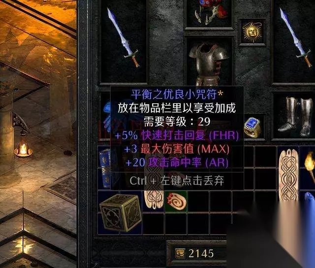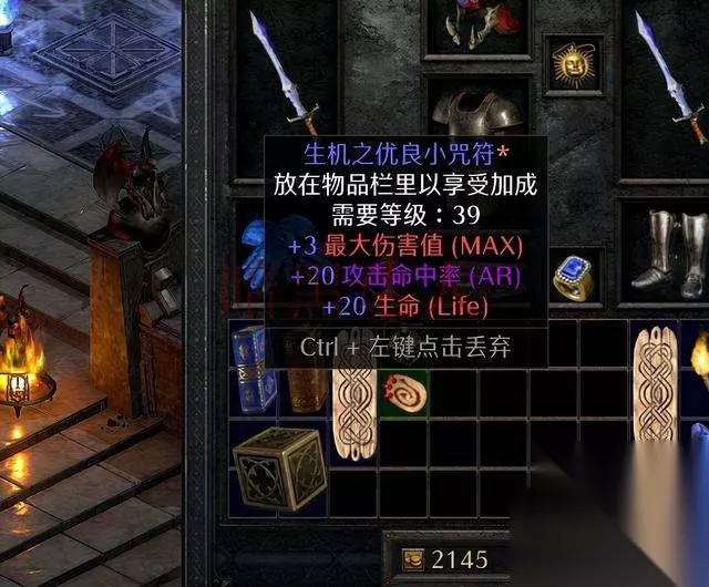 暗黑破坏神2重制版除了角色各部位使用的装备外,还有很多能提升角色综合能力的辅助物品和状态,其中放在背包中能为角色提供属性加成的咒符(护身符)是较为常见的物品,咒符根据背包中所占空间一共分为三种:小型(1格)、大型(2格)和超大型(3格)。